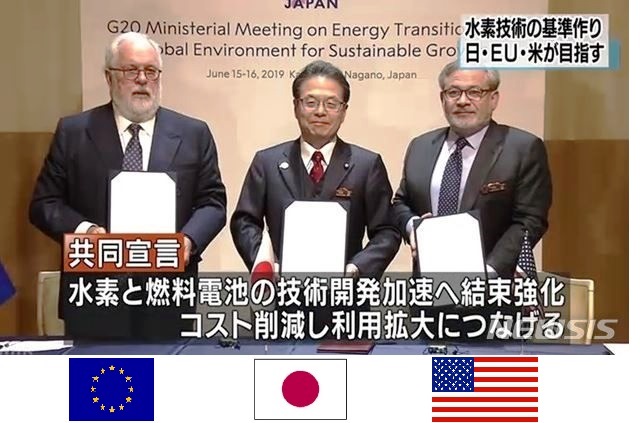 NHKや毎日新聞などによると、今月15日に長野県軽井沢で開かれた主要20カ国・地域(G20)エネルギー・環境関係閣僚会合で、日本経済産業省と米国エネルギー省、EU欧州委員会エネルギー総局の閣僚が水素エネルギー技術に関連して連携していくことに合意して共同宣言を発表した。