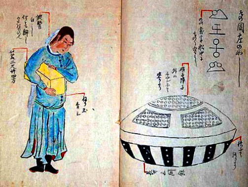 江戸時代、石川県能登半島にある眉丈山の中腹に、夜な夜な円盤状の形をした物体が飛んでいるのが目撃された。しかも円盤は発光しながら山を東から西に飛行するのだとか。