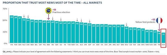 世界の主要38ヵ国で進めたマスコミの信頼度調査で、韓国のマスコミの信頼度は最下位となった。 韓国のマスコミは2016年当該調査に初めて含まれてから、4年連続の信頼度の最下位という不名誉に陥った。