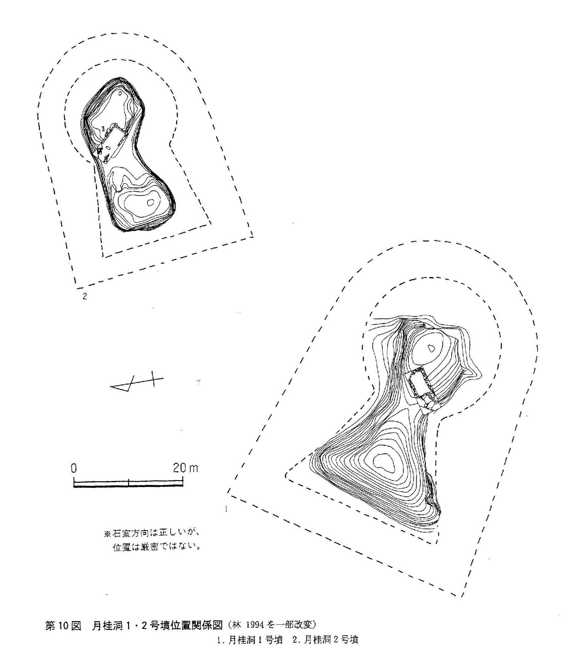 ※画像:「月桂洞1号墳」・「月桂洞2号墳」実測図 (岡内 1996)貼付した画像を見てほしいんだけれど(岡内 1996)「月桂洞1号墳」が、