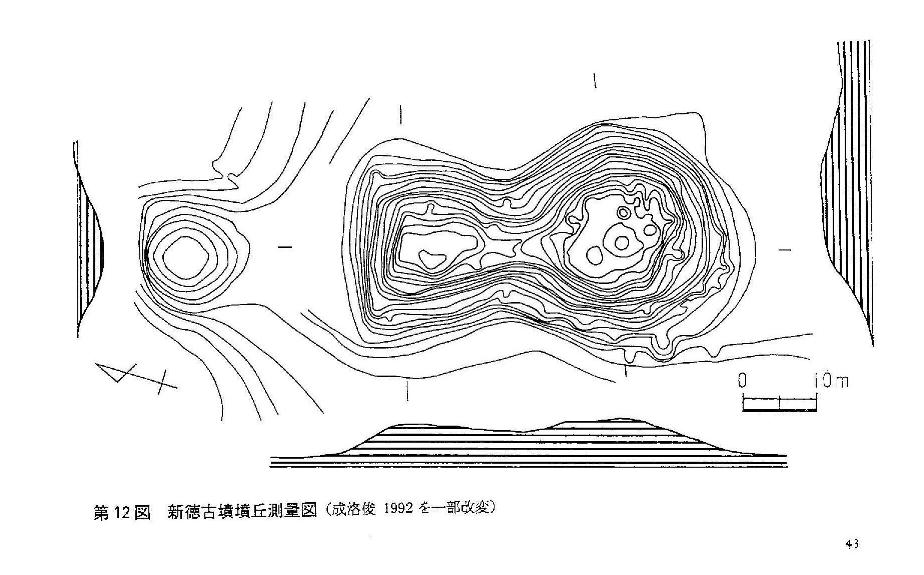 ※画像:「新徳1号墳」実測図。こちらは一応「段築」が見える。(岡内 1996)一応先に挙げたように列島の相似墳丘ではあるから大まかな寸法についての情報は