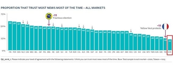 韓国国民の言論信頼性は21%で、昨年より1%ポイントより低下した。 2018年11月、政府の油類税引き上げ発表で触発された「黄色いチョッキデモ」の影響で、昨年の調査で信頼性が大幅に下落し、韓国と一緒に信頼性最下位群に囲まれたフランスは、今年も23%で韓国のすぐ前の席にとどまった。政治・経済的理由デモが激化しているチリ(30%)、香港(30%)、イギリス(28%)などは、メディアの信頼性が12〜16%ポイント下落した。