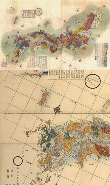 (2)1844年に製作された古地図で、現在日本外務省のホームページに掲載されたものと同じもの。鬱陵島・独島に日本の領土である意味の黄色で塗りつぶされている。「官許」という文字がない。