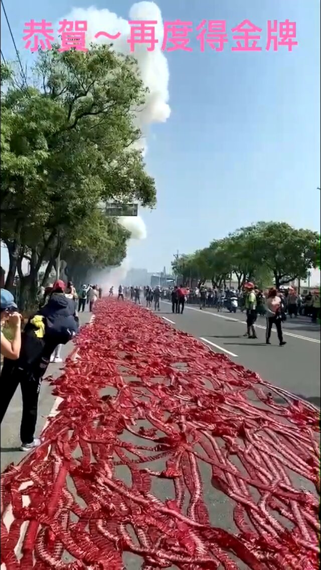 写真2枚目:麟洋配を祝福する3分にも及ぶ爆竹の赤い帯(台湾・金門島)