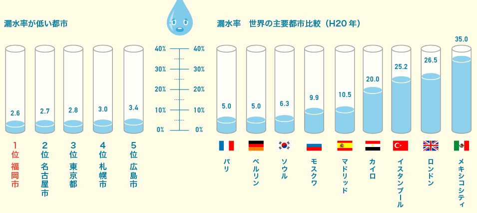 最悪だな日本の上水道漏水率は10%以上の自治体もありますが、全国平均では約5.0%と、海外の都市と比較して低い漏水率を実現しています。