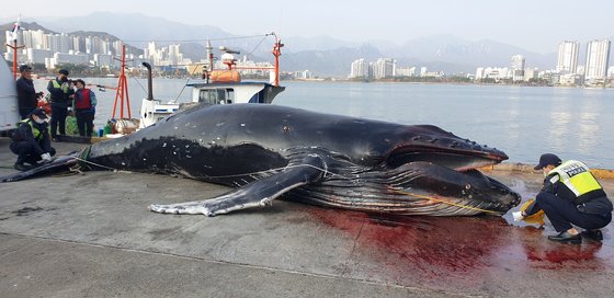 もりでクジラを捕獲、韓国海洋警察が55人を一斉摘発