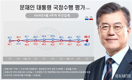 世論調査専門機関リアルメーターがYTNの依頼で、去る17日から21日まで調査し、24日に発表した6月3週目の週間集計結果によると、文大統領が国政遂行をよく(うまく)やっているとする肯定評価は、先週に比べて2.8ポイント下落の46.7%だった。