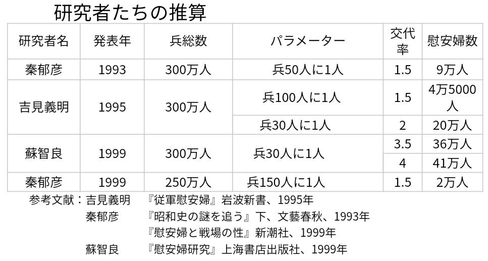 慰安婦の人数を多く主張したいとしたら、実際は一日あたりの相手をする人数は少なくなる。かといって、潤沢に交代体制を組んでいるほど慰安所に経済的余裕があったのかとの疑問が生じる。試算も非現実的になる。