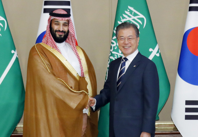 문 대통령은 빈 살만 왕세자와 26일 청와대 본관 2층 접견실에서 회담을 가진 후 양해각서(MOU)
