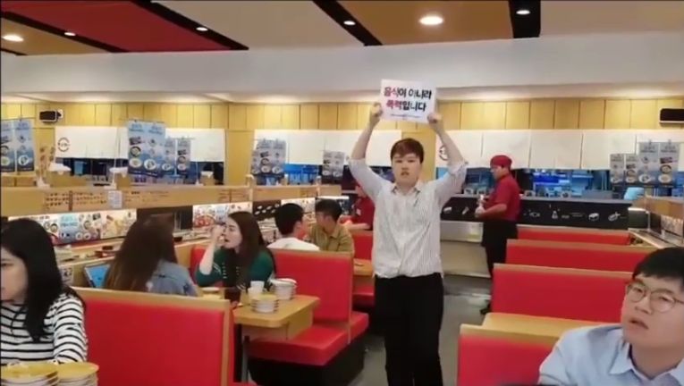 「食べ物ではなく暴力」韓国のスシローでデモをする女性が物議