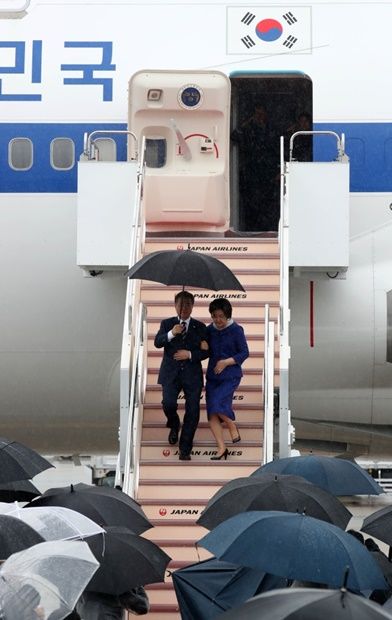 激しい雨が降りつける中、文大統領が自ら傘を差したまま、屋根がないタラップ(階段)から空軍1号機を降りてきたことに対して、一部では「日本側が冷遇した」という指摘が出たが、青瓦台(チョンワデ、大統領府)はこれを否定した。