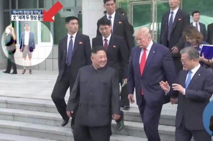 このネチズンは南‧北‧米首脳が過去30日板門店南側自由の家を出る写真を一緒に上げた。写真を見ると、金委員長が何か説明するドア大統領を見てパッと笑っている。両首脳の裏側でトランプ大統領が厳粛な表情で階段を降りてきている。