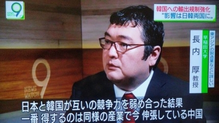 뉴스워치 9은 일본 지상파 채널인 'NHK 종합'이 매일 오후 9시에 방영하는 메인 뉴스 프로그램이다. 이날 뉴스워치 9은 두 번째 꼭지로 첨단 소재 수출 규제 조치를 5분에 걸쳐 다뤘다.