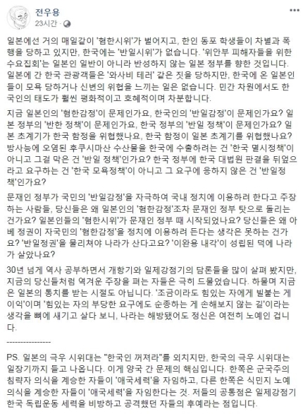 그러면서 전씨는 “지금은 일본의 통치를 받는 시절도 아니다. 조금이라도 힘있는 자에게 빌붙는 게 이익이며 힘 있는 자의 부당한 요구에도 순종하는 게 손해보지 않는 길이라는 생각을 뼈에 새기고 살다 보니, 나라는 해방됐어도 정신은 여전히 노예”라고 지적했다. 또한 “일본의 극우 시위대는 ‘한국인 꺼져라’를 외치지만 한국의 극우시위대는 일장기까지 들고 나온다. 이게 양국 간 문제의 핵심”이라며 “한쪽은 군국주의 침략자 의식을 계승한 자들이고 다른 한쪽은 식민지 노예 의식을 계승한 자들인데 공통점은 일제 강점기 한국의 독립운동 세력을 비방하고 공격했던 자들의 후예”라고도 했다.
