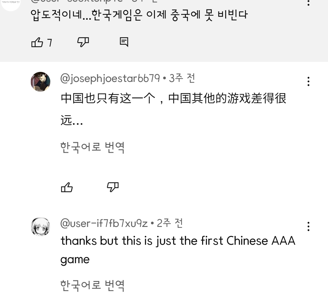 이번에 출시하는 검은 신화 오공의 티저영상을 보고 확실히 한국 게임을 뛰어넘었다. 라고 칭찬 코멘트를 작성했는데 중국인들이 한국 유투브까지 와서 코멘트를 작성해줬다.