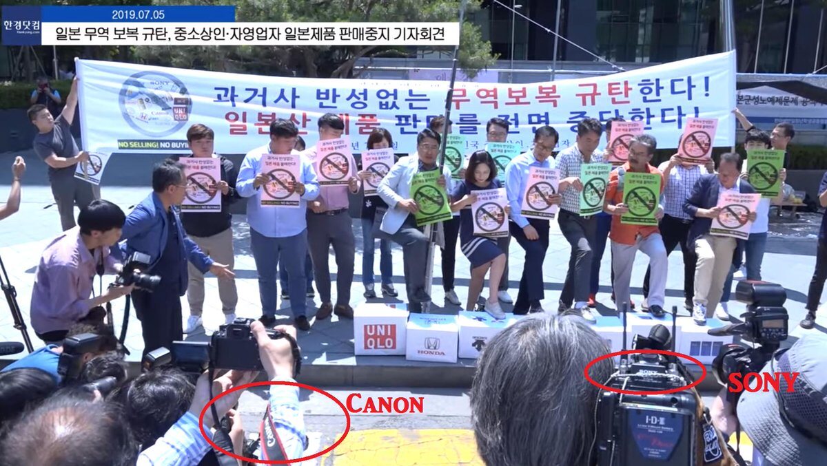 韓国中小商人自営業者総連合会は5日、ソウルの日本大使館前で記者会見を開き、日本の対韓輸出規制強化への対抗措置として、日本製品の販売を中止すると発表した。