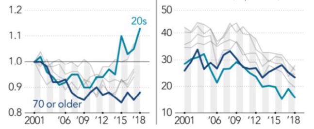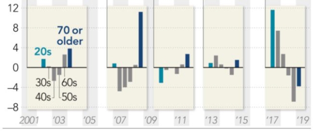 니혼게이자이신문이 지난달 말 실시한 여론조사에서 60대 이상 유권자의 아베 정부 지지율은 49%였다. 그런데 20대 유권자의 지지율은 이보다 높은 70%에 달했다. 자민당 정권 초기인 2012년부터 2016년까지만 해도 60대 이상과 20대의 지지율 차이가 크지 않았다. 그런데 2017년 이후 20대의 지지율이 급상승하면서 격차가 21%포인트까지 벌어졌다.