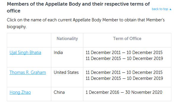 WTOの紛争解決機関の上級委員会は本来は7人の判事で構成される。現在の判事長は中国人。