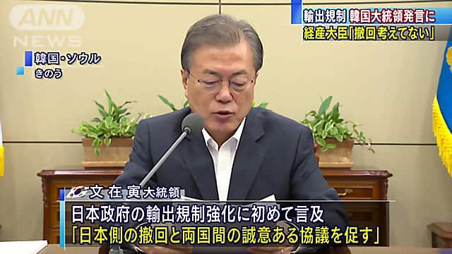 韓国の文大統領は8日、日本政府が韓国への半導体の材料などの輸出規制を強化した措置に初めて言及し、「日本側の撤回と両国間の誠意ある協議を促す」などと述べました。