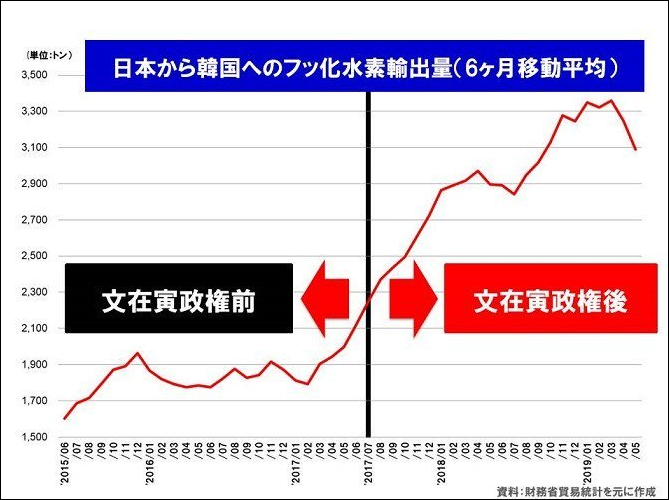 添付資料は「フッ化水素」の輸出入に関する韓国の韓国貿易協会による対日依存度(%)と日本財務省貿易統計による対韓輸出量(t)の各推移のグラフ表で、単位は異なってもグラフの上下は共に同じ傾向を示す筈が、文在寅政権発足後の対日依存度と対韓輸出量は整合性が取れなく対韓輸出量が激増しています。