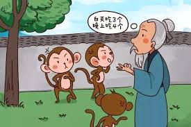 中国、宋の狙公(そこう)が、飼っている猿にトチの実を与えるのに、朝に三つ、暮れに四つやると言うと猿が少ないと怒ったため、朝に四つ、暮れに三つやると言うと、たいそう喜んだという「荘子」斉物論などに見える故事から。WTOが効いたwwwってホルホルしてた。
