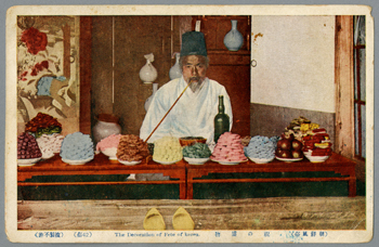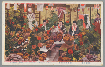 草を編んで薦(莚、敷物の事です)とし、色々な皮で表を覆い、模様のある皮で縁取りをする。朝鮮に「料理」なんて無かったんですよ。