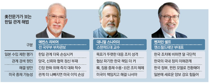 例えば、米国の誰かが公に韓日を行き来して考えを伝え、メディアに対応するなどの役割をする時、どちらか一方の体面を傷つけずにするのは難しい。米国は、韓日両国とそれぞれ歴史的関係がある。(下手に関与すれば)米国は両国どちらからも逆風にあうかもしれない」と言いながらも、「韓日が建設的な解決策を見いだせるよう、米国が水面下で静かに推進者役をすることはできるだろう」と述べた。