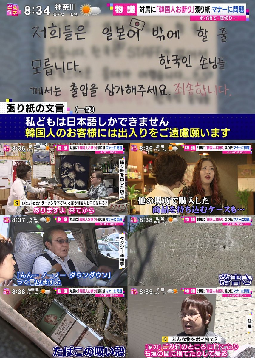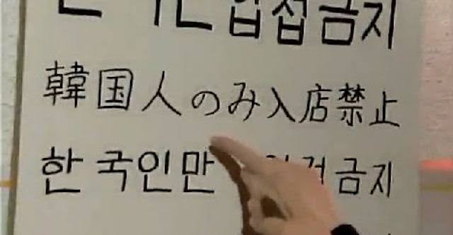 長崎県対馬の繁華街に「韓国人お断り」の張り紙が出ている。「私どもは日本語しかできません。韓国人のお客様には出入りをご遠慮願います」「日本語を話せる方を同伴してください」などと書かれている。