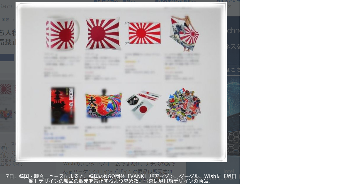 2020年8月7日、韓国・聯合ニュースによると、インターネットを通して韓国の対外広報を行うNGO団体「VANK」が、世界的な電子商取引プラットフォームを運営するアマゾン、グーグル、Wish(ウィッシュ)に対し「旭日旗」デザイン製品の販売禁止を求める書簡を送付した。