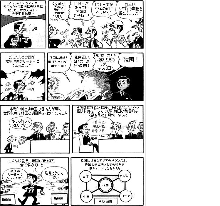 ②数千年間中国等に押さえ付けられて来た負け惜しみであり、本来は力を得るべきものではないが、米国が善、日本が悪というプロパガンダとその後の冷戦で南朝鮮を引き留めるために米国が支持したために間違って主役になってしまったのだ。