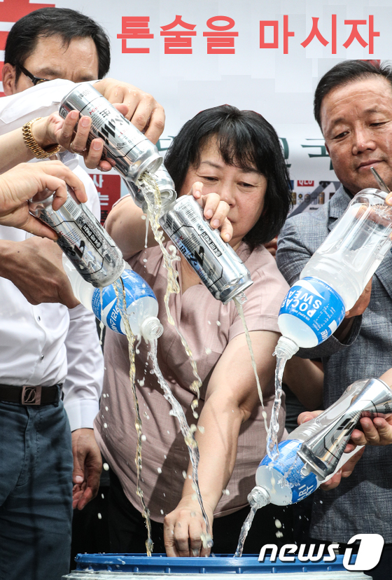 韓国スーパー協会の会員らは日本製のビールやスポーツ飲料をバケツにぶちまけるというパフォーマンスを決行。
