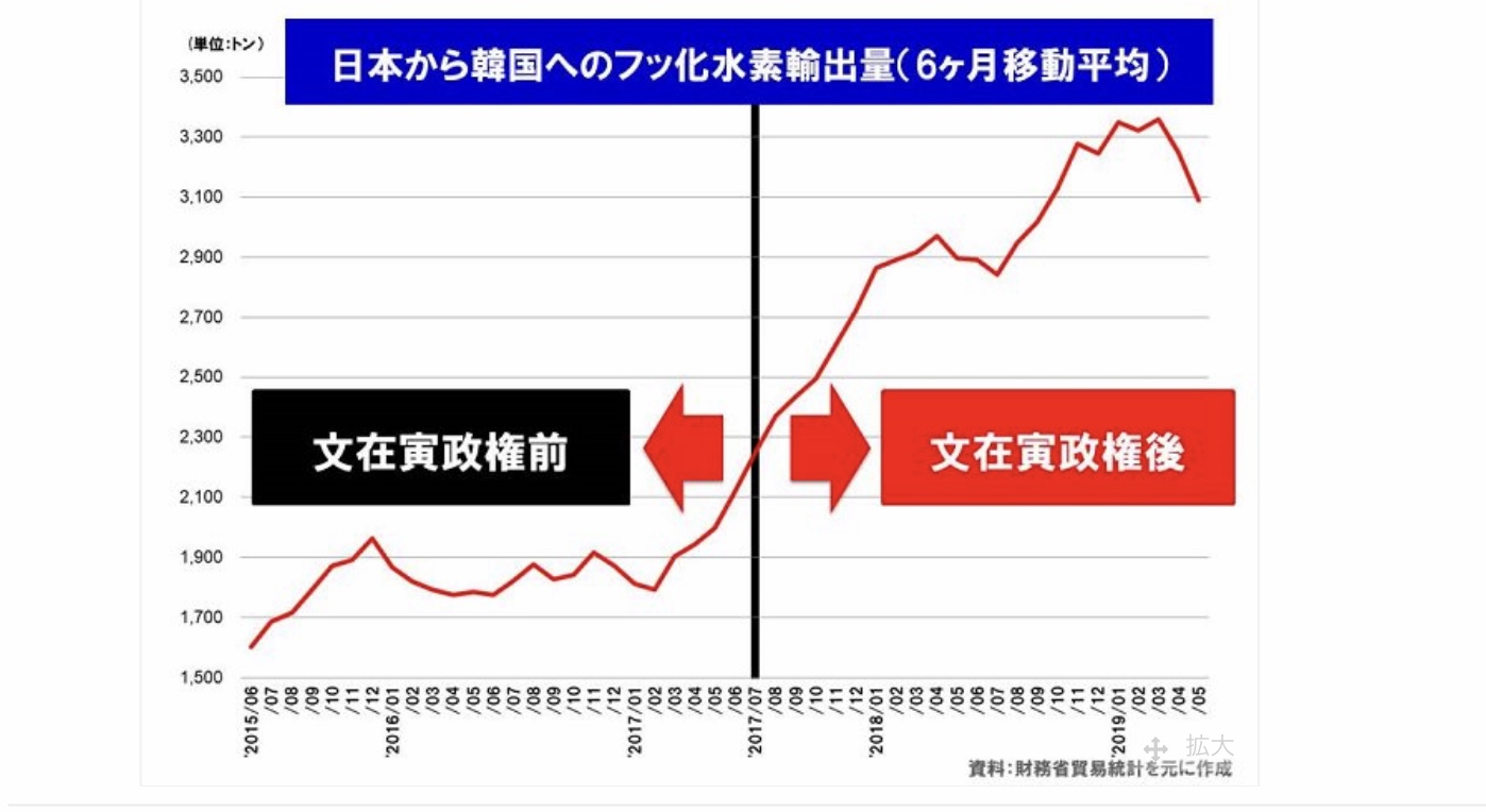 今回の日本政府の処置は、政治問題は関係無いようで、純粋にフッ化水素の韓国側の管理に問題があったのが原因のようです。 参考に図を付けます。 これは韓国のフッ化水素の日本からの輸入量です。