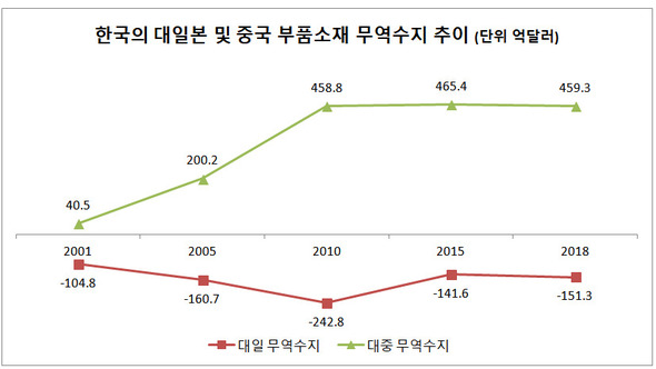 15日、産業通商資源部によると、昨年、韓国の部品・素材の輸出は半導体の好調に支えられ、3162億ドルで史上最高を記録した。部品素材貿易収支も1391億ドルとして最高だった。しかし、昨年日本に対する部品素材貿易収支は151億3千万ドルの赤字を記録した。昨年の対日貿易赤字240億8千万ドルの63%を占める。慢性的な対日貿易赤字の主な原因が部品素材の依存にあるのだ。