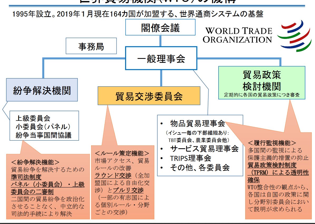 何してるかっていうと物品の貿易、金融や情報通信、知的財産権などを、国と国が商業取引するときのルールを協議したり、今回の日韓みたいな貿易紛争が起きたときに解決するため最終的ジャッジをつけてもらったりするところ。