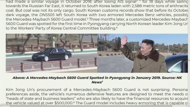 報告書によると、車両はメルセデス・マイバッハS600ガードで、昨年6月にオランダ・ロッテルダムのターミナルに運び込まれ出港。中国・大連、大阪、韓国・釜山の順で別の船に積み替えながら10月にロシアにわたり、北朝鮮に空輸された可能性があるという。北朝鮮情報サイトが今年1月、平壌を走る同型の車両の画像を伝えている。