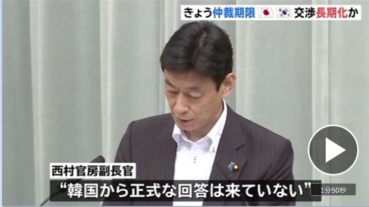 やっと韓国へ制裁ができるのか?太平洋戦争中の「徴用」をめぐる問題で、日韓請求権協定に基づいて日本政府が要請している仲裁委員会の開催に必要な手続きの最終期限を18日迎えましたが、韓国外務省の報道官は、午後の定例の記者会見で「日本が一方的に恣意的(しいてき)に設定した日付だ」と述べて、手続きに応じない姿勢を示しました。