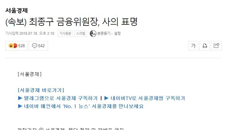 [속보]최종구 금융위원장 “인사권자에 사의 표명”