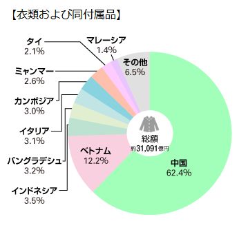 衣類は、約7割が中国から輸入されていて、一流ブランド品の洋服や靴(くつ)なども、中国で作られているモノが非常に増えています。皆さんが着たり履(は)いたりしているモノも、タグ(裏側についている小さな添(そ)え書き)に、〝メイド・イン・チャイナ(Made in China)〟と書かれているものが多くなっています。