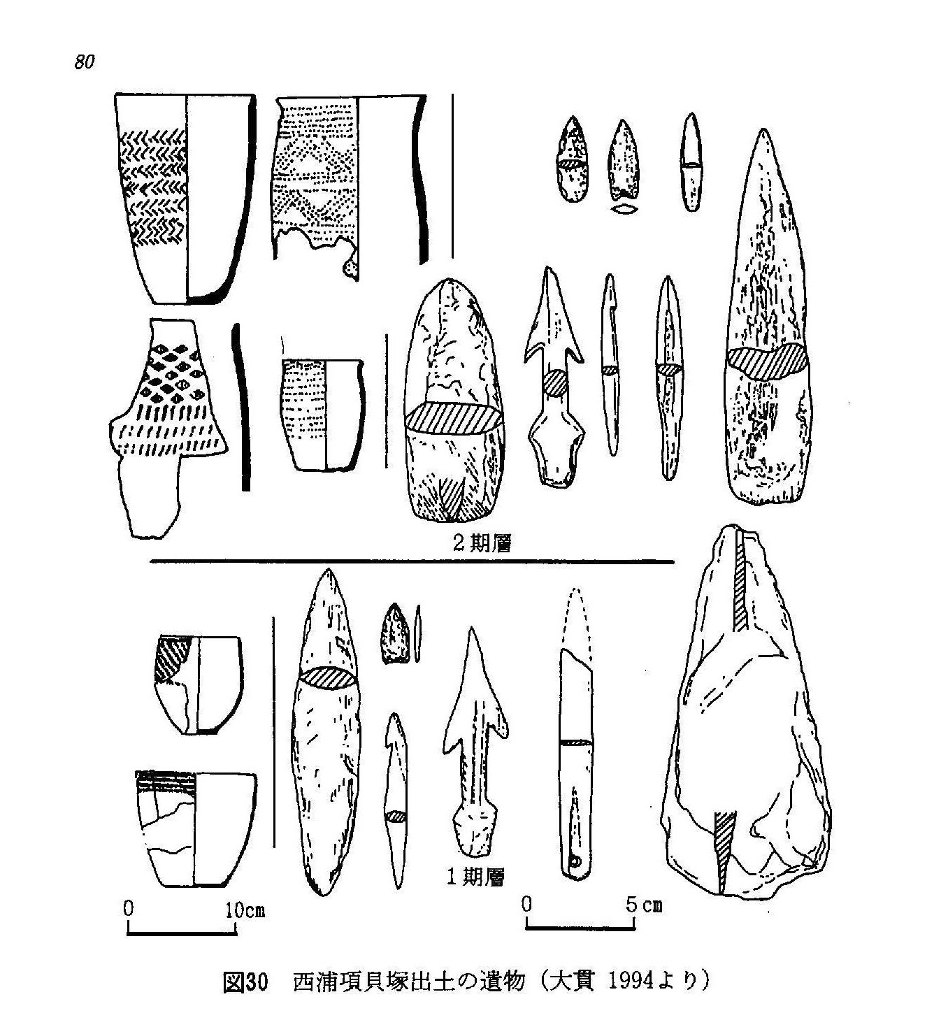 図版:西浦項(Sǒ-P'ohang)遺跡出土遺物(大貫 1998)で、絶対年代が与えられている物を見ていくと、