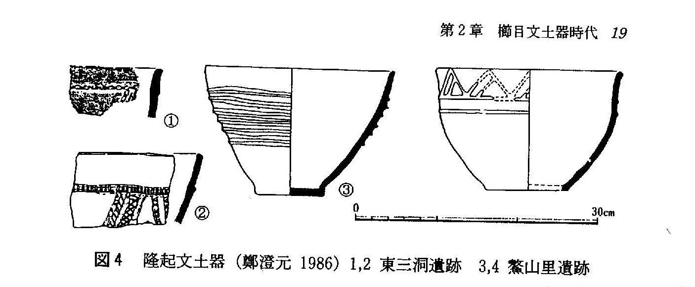 「高城文岩里遺跡」(고성문암리?)、「襄陽鰲山里遺跡」(오산리 유적?)、「晶寧飛鳳里遺跡」(창녕 비봉리 유적?)などでは、上記の「隆起文土器」が出土した層より下の層から、隆起文ではなく、