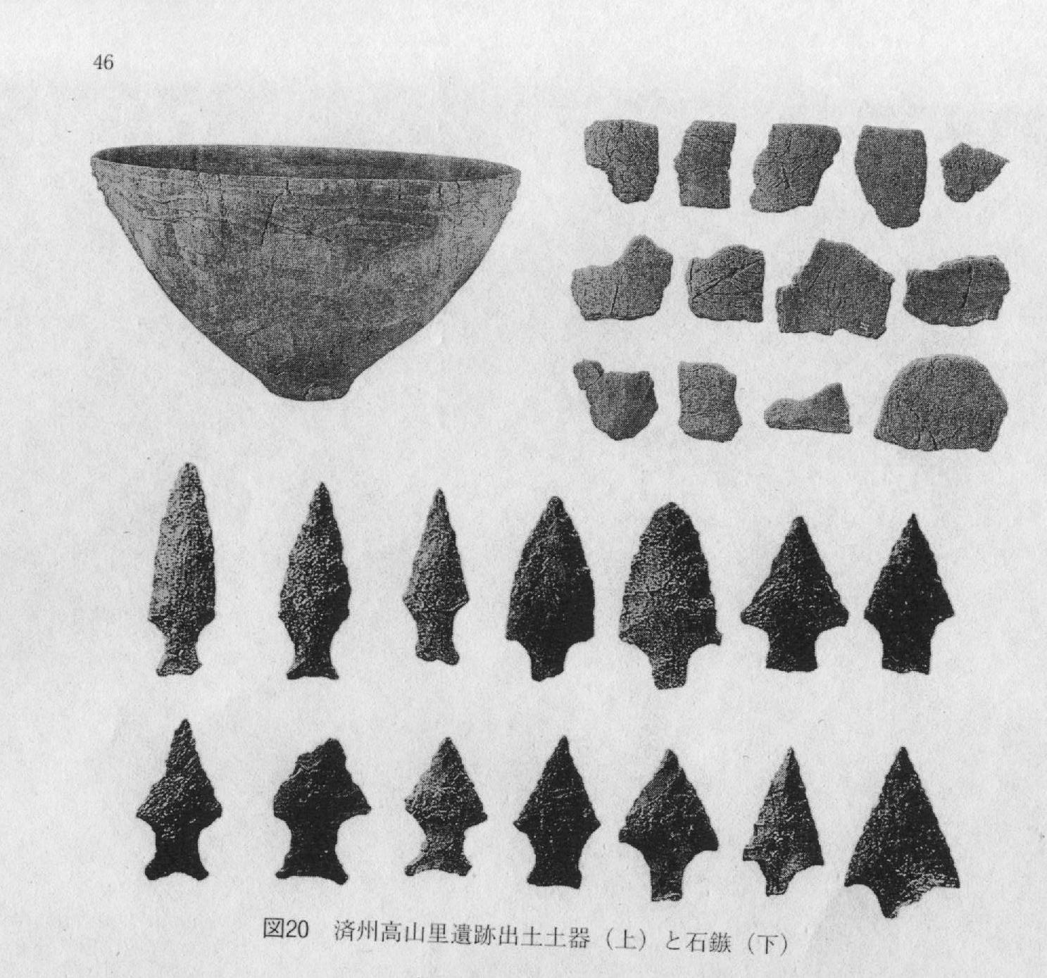 先述の済州島の高山里遺跡の最下層から細石器、石鏃を伴って発見された