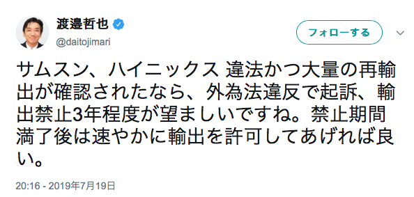 サムスン、ハイニックス 違法かつ大量の再輸出が確認されたなら、外為法違反で起訴、輸出禁止3年程度が望ましいですね。禁止期間満了後は速やかに輸出を許可してあげれば良い。FACT嫌いの韓国人が来ないスレ