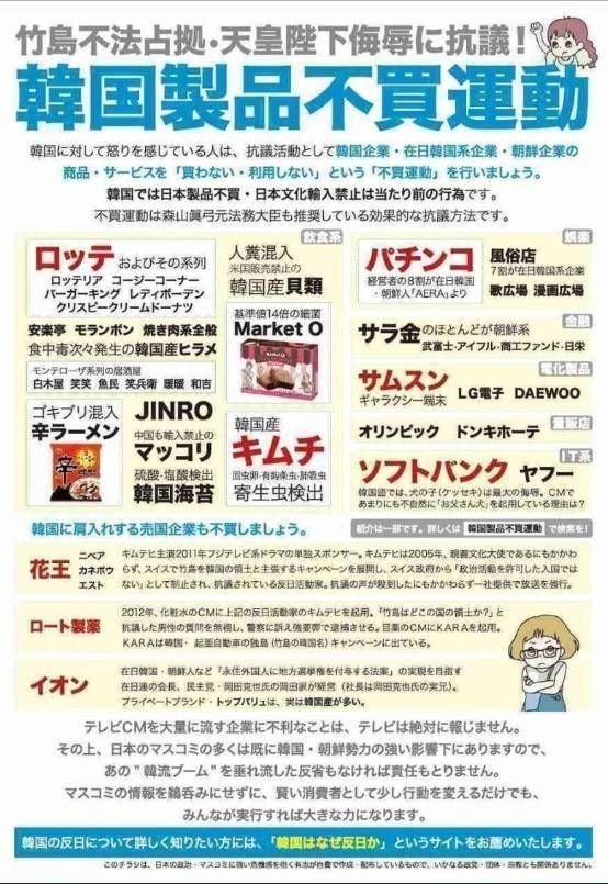 18日、国内の主要なオンラインコミュニティには「韓国製品不買運動」というタイトルの日本のポスターが公開された。このポスターでは、キムチをはじめ、農心辛ラーメンとハイト進路のマッコリ、両班海苔、お菓子のような食料品やサムスン、LG、大宇などの家電製品、化粧品をボイコット対象に挙げた。在日である孫正義会長が運営する、日本の情報通信(IT)企業ソフトバンクや在日が多く運営するという噂があるパチンコ(ギャンブルの一種)も名を連ねた。キムチから寄生虫が出たなどの説明も付け加えている。(以下省略)>>1