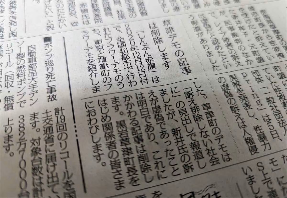 「唯一共産党の機関紙『しんぶん赤旗』の編集幹部は草津町に来て、私に『間違った記事を出してしまった』と謝罪し、その後、訂正記事を出した。世の中はひどいですね…。いわれっぱなしだ。たたかれるときはたたかれたが、それきり謝らない。間違ったら『ごめんなさい』ではないか」職場以外では女性が強い。