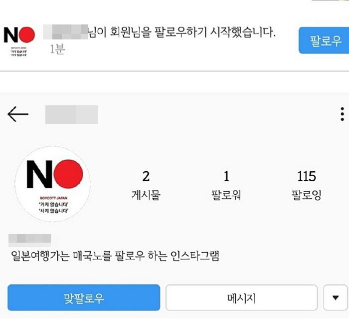 これらのアカウントは不買運動を象徴とするプロフィール画像である「NO」を使い、SNSを探し回りながら日本旅行に行った韓国人のアカウントを静かにフォローするし事実上の不買運動に参加しなかったとして彼らを公開攻撃するのだ。