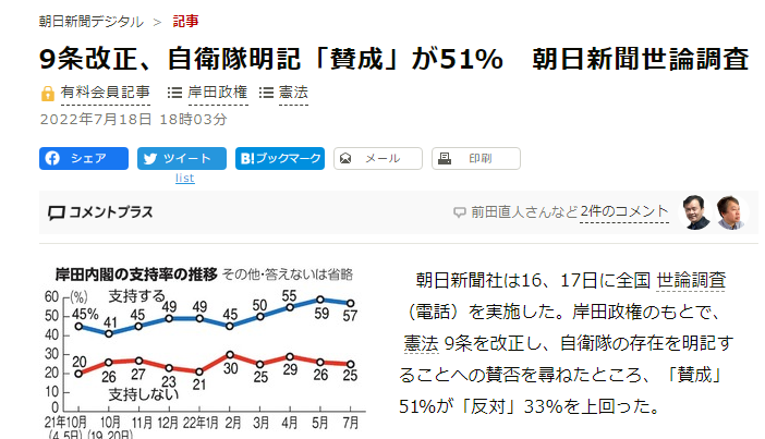 あの朝日でさえ「賛成」が上回っているw ウクライナ侵攻を見て傾いた今がチャンスなんだが(笑)>>994