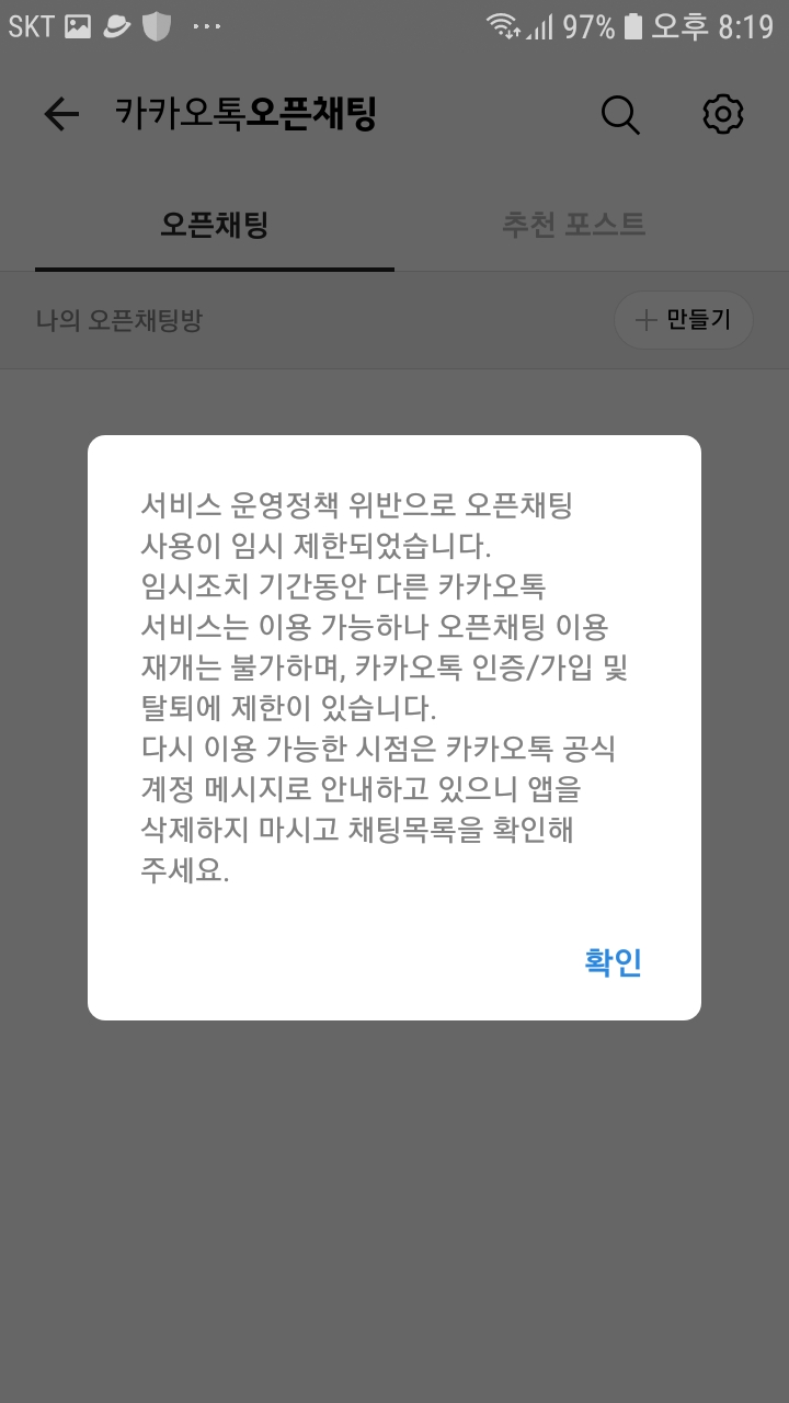 반일 카톡방에서 강제추방된건 개돼지들이 반일에 선동된것 뿐이니 그러려니하고 넘어갔지만 몇분후 느닷없이 카카오톡 오픈채팅방이 정지되었다는 통보가 왔다. 순간 어이가 없었다. 내가 틀린소리를 한적도 없고 거짓말을 하지도 않았는데 서비스 운영정책 위반행위를 했다며 정지를 먹인거였다.