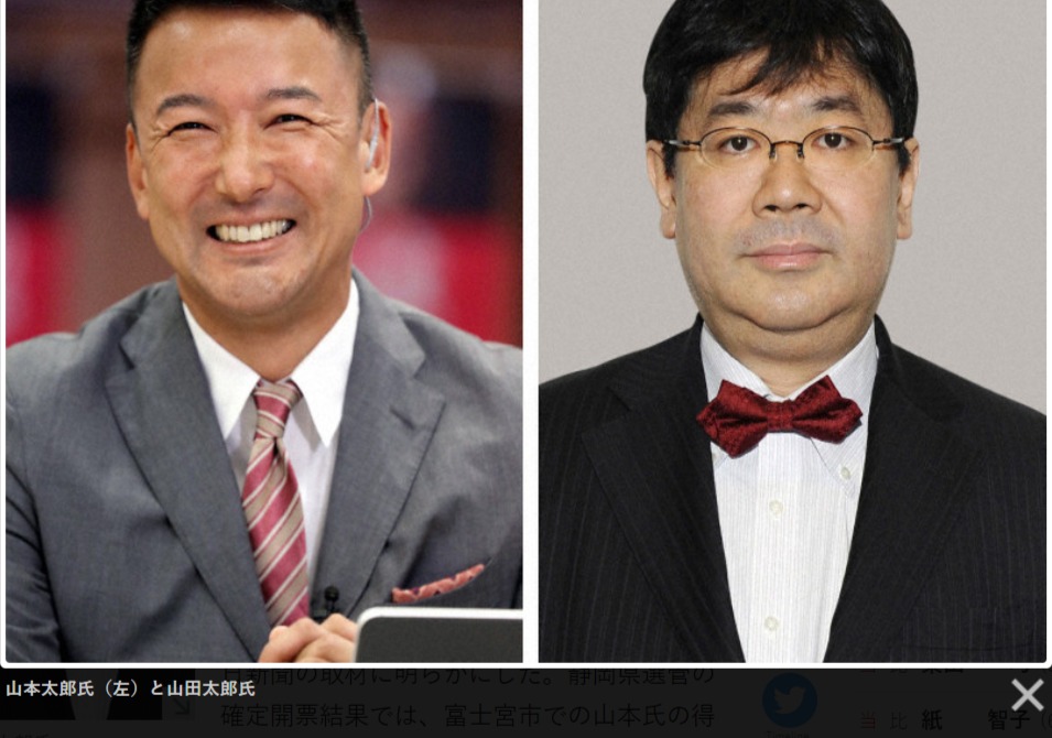 半分ぐらいの操作にしとけば気づかれなかったのに静岡県選挙管理委員会は23日、21日投開票の参院選比例代表で、同県富士宮市選管が、自民党の山田太郎氏の票を、れいわ新選組代表の山本太郎氏の票に誤って計上していたと明らかにした。県選管によると、山本太郎氏は1453票で、山田太郎氏は0票だった。