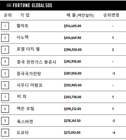 今年の1位は昨年に続いて米ウォルマートだった。中国エネルギー企業シノペック(中国石油化工集団公司)、オランダと英国の合弁石油企業ロイヤル・ダッチ・シェルが後に続いた。