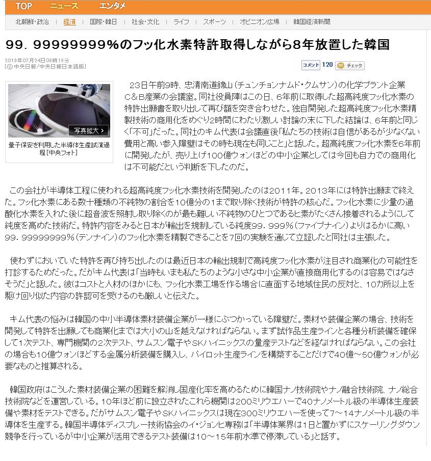 確認機材は日本製だから不買で買えないし99.99999999%の「フッ化水素」特許取得しながら8年も放置した韓国